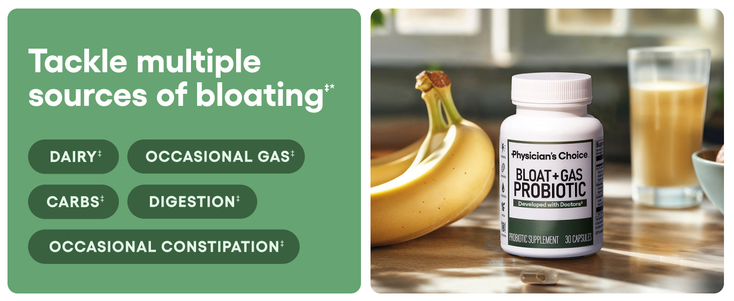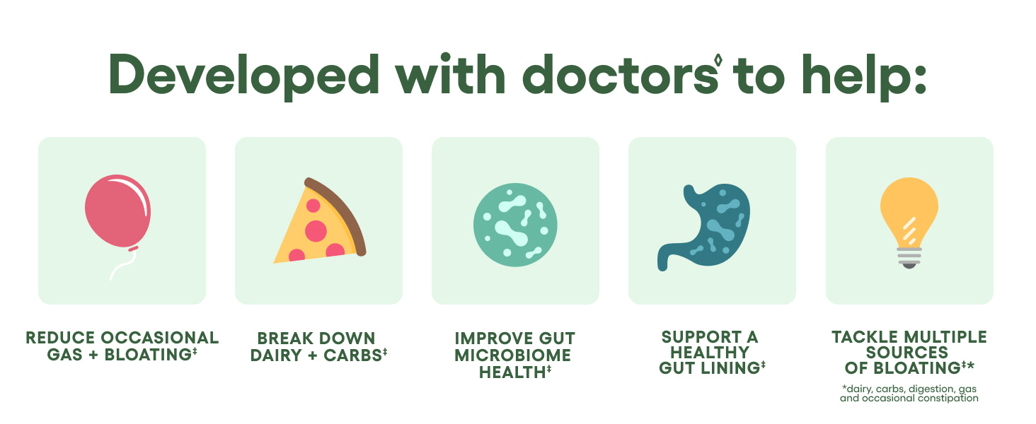 Daily digestive support designed to target bloating and gas at the root. With advanced probiotics and doctor developed formulation, it helps ease meal time discomfort and reduce occasional bloating.